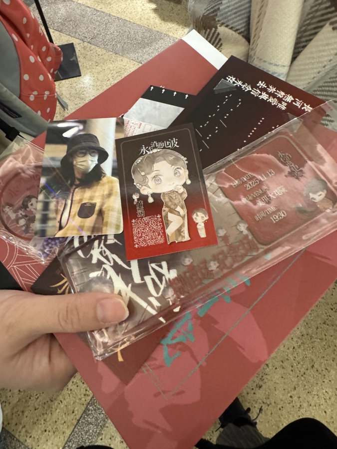 回到肇始地,感动又叹息的不仅是主创和演员,还有伴随《电波》多年的剧迷。上演七点半运行,五点半就有剧迷涌入戏院。他们带着亲手制作的“独家物料”交换、共享。在旋转楼梯旁,恭候领取物料的队列鬈曲至前厅,尤密斯手里拿了一堆“剧迷”共享的好物,有朱洁静的小像,有印着“电波”的透明卡片,还有以《渔光曲》为配景的怀旧杂志手绘封面。