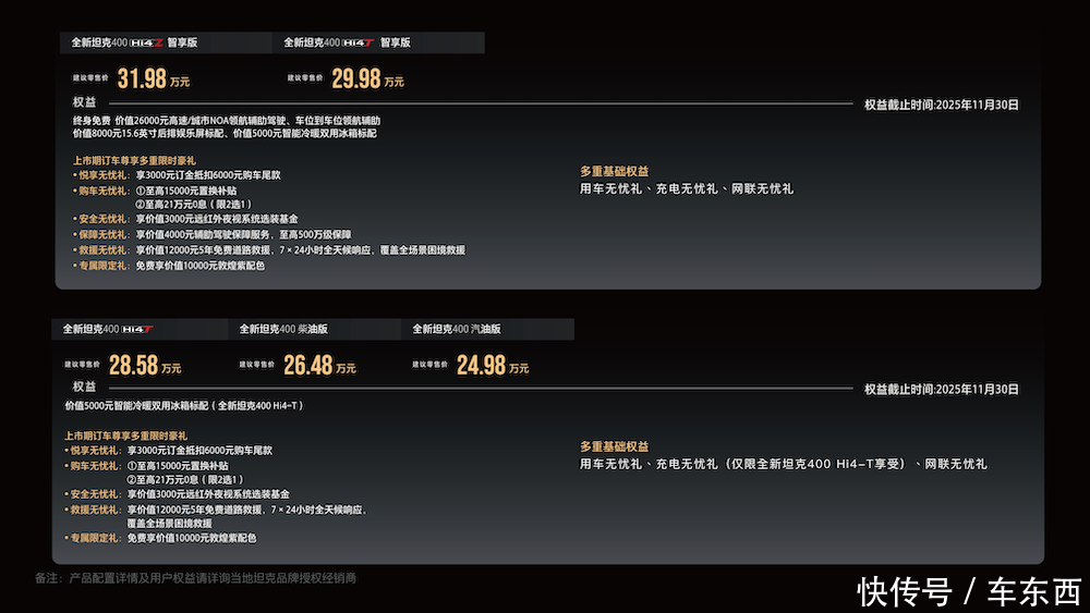 车东西11月10日音讯,日前,全新坦克400弘扬上市,其中,汽油版车型指引价为24.98万元,柴油版车型指引价为26.48万元,Hi4-T门径版指引价为28.58万元,Hi4-T智享版指引价为29.98万元,Hi4-Z智享版指引价为31.98万元。