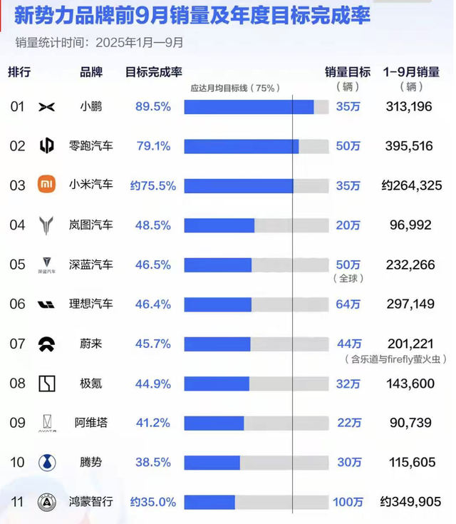 放胆面前,小鹏、零跑与小米汽车在磋议完成率上位居前方,这也与咫尺三家车企相对超越的销量施展相契合。小鹏汽车以89.5%的完成率超越群雄,1-9月的累计销量已达31.32万辆,距离其35万辆的年度磋议仅一步之遥。