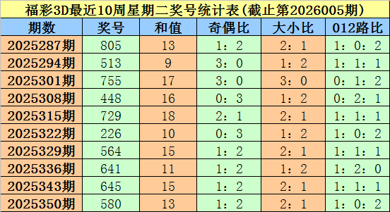 大鹏福彩3D第2026006期星期二奖号分析: