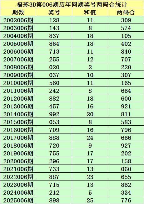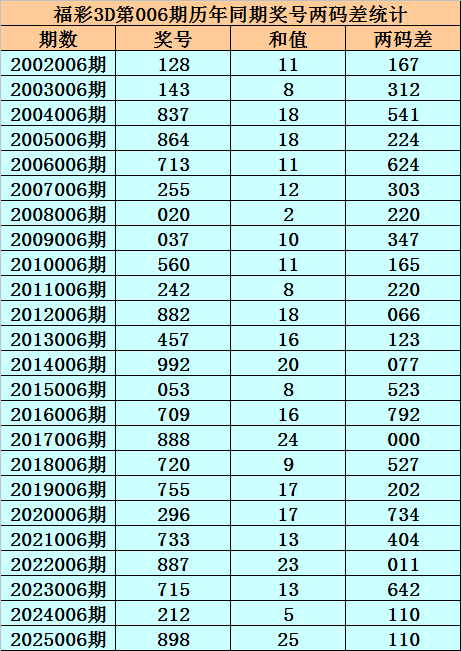 福彩3D第006期,历史上期开出24次奖号,其奖号永别为:128、143、837、864、713、255、020、037、560、242、882、457、992、053、709、888、720、755、296、733、887、715、212、898,奖号两码合差永别开出: